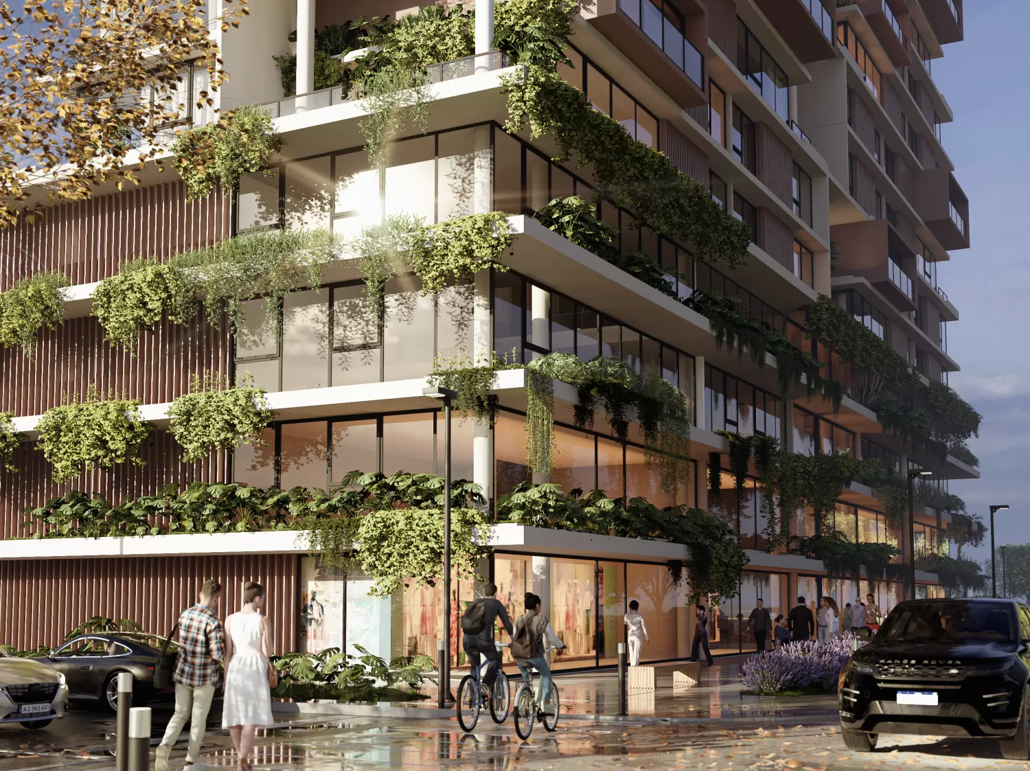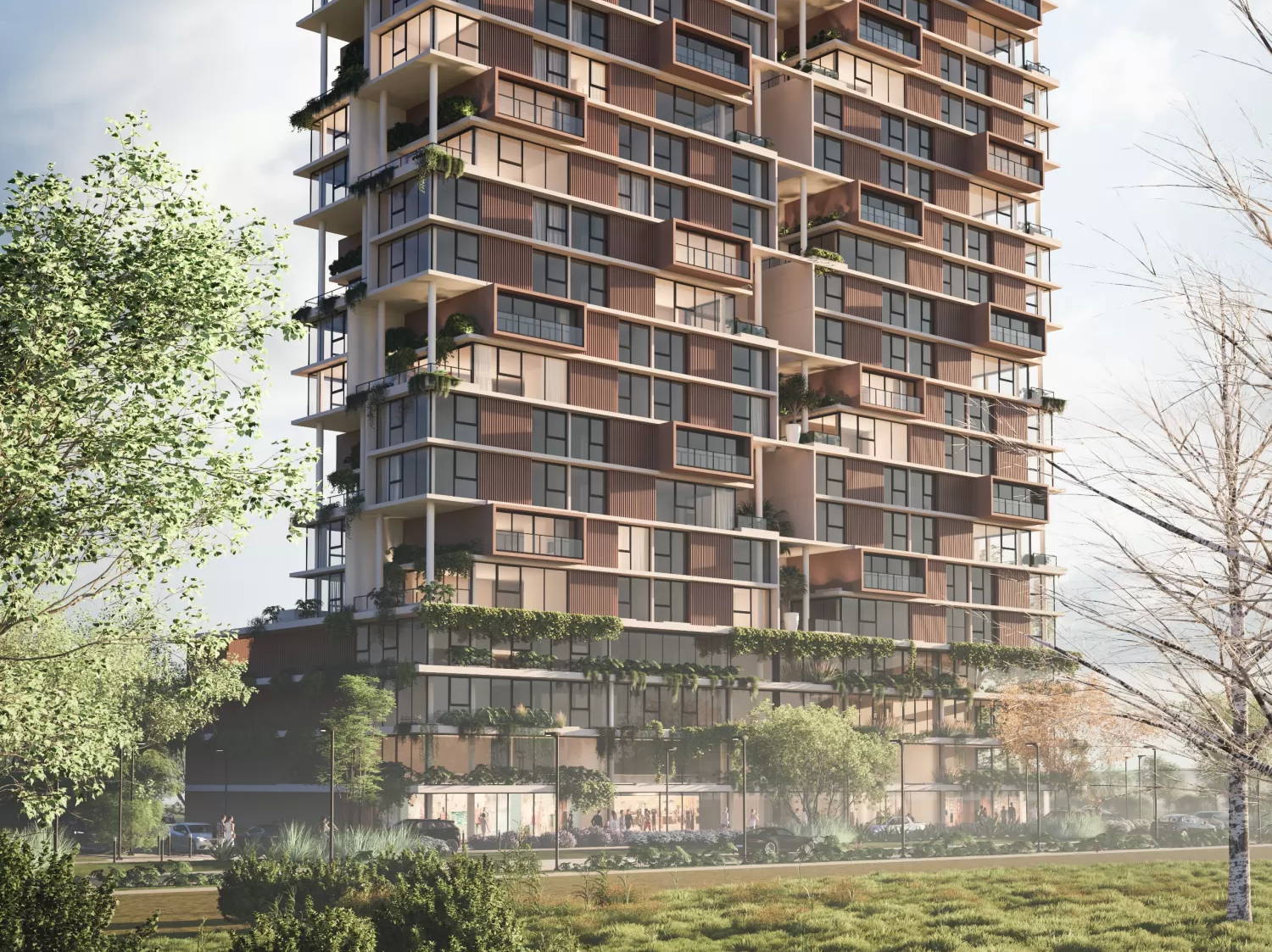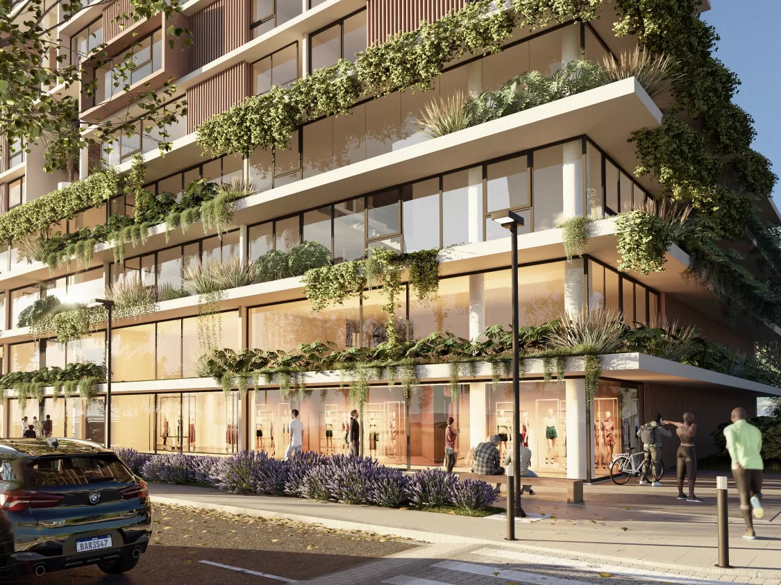 Its facade, featuring biophilic elements, aluminum brise-soleils, and expansive glass panels, creates visual lightness and seamless integration with the surroundings. The cubic volumes, rounded pillars, and active corners transform the building into an elegant and contemporary urban landmark.